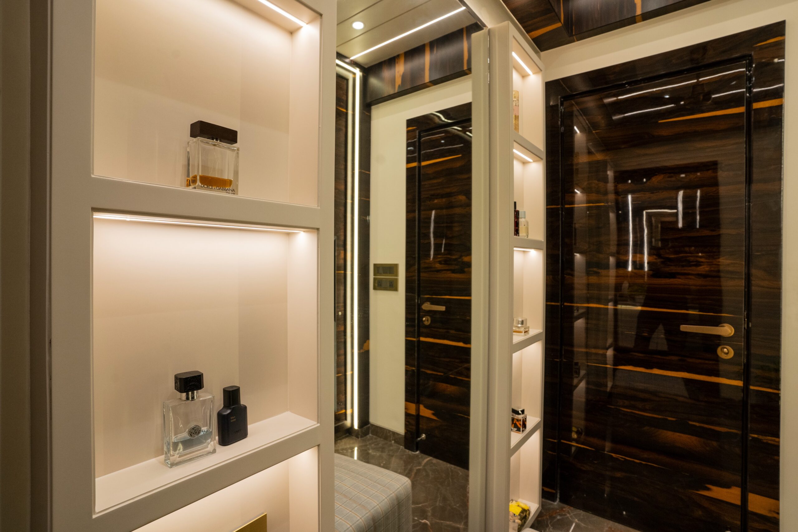 Unique specifications might involve walk-in showers, freestanding tubs, rain showerheads, vanities, mirrors, and ample storage solutions, like cabinets or shelves, to keep essentials within reach.