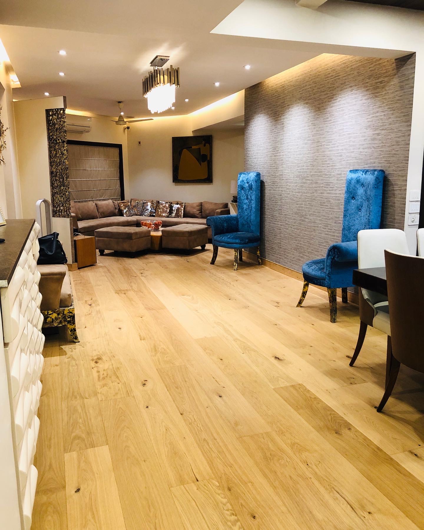 At Panache, we aim to balance proportions, texture, and visual flow to ensure the room feels spacious yet cozy. We incorporate natural and artificial options like floor and table lamps for ambiance. Flexibility is another important aspect; we design the living rooms to adapt to various activities, whether movie night, reading, or family gatherings. We incorporate multifunctional furniture to maximize space while keeping the room organized.